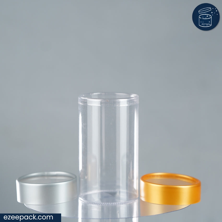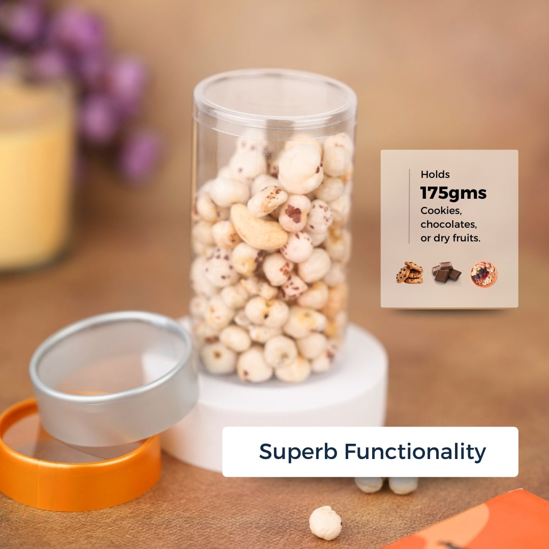 Our 375ml Clear Jar, available with clear, gold, or silver lids, offers extra storage with a stylish touch. Crafted from high-quality food-grade 250 micron PVC, it combines durability with an elegant gloss shine. With dimensions of 2.5-inch diameter and 4.5-inch height, this jar comfortably holds 6-7 cookies, more chocolates, or extra dry fruits, making it ideal for larger storage needs. The high transparency and uniform wall thickness provide a sleek display, while the secure lid keeps your treats fresh. Lightweight and easy to handle, it’s a perfect alternative to heavy glass jars and unreliable PET screw lids. Ideal for gifting professionals and general storage, this jar adds a touch of elegance to any setting.