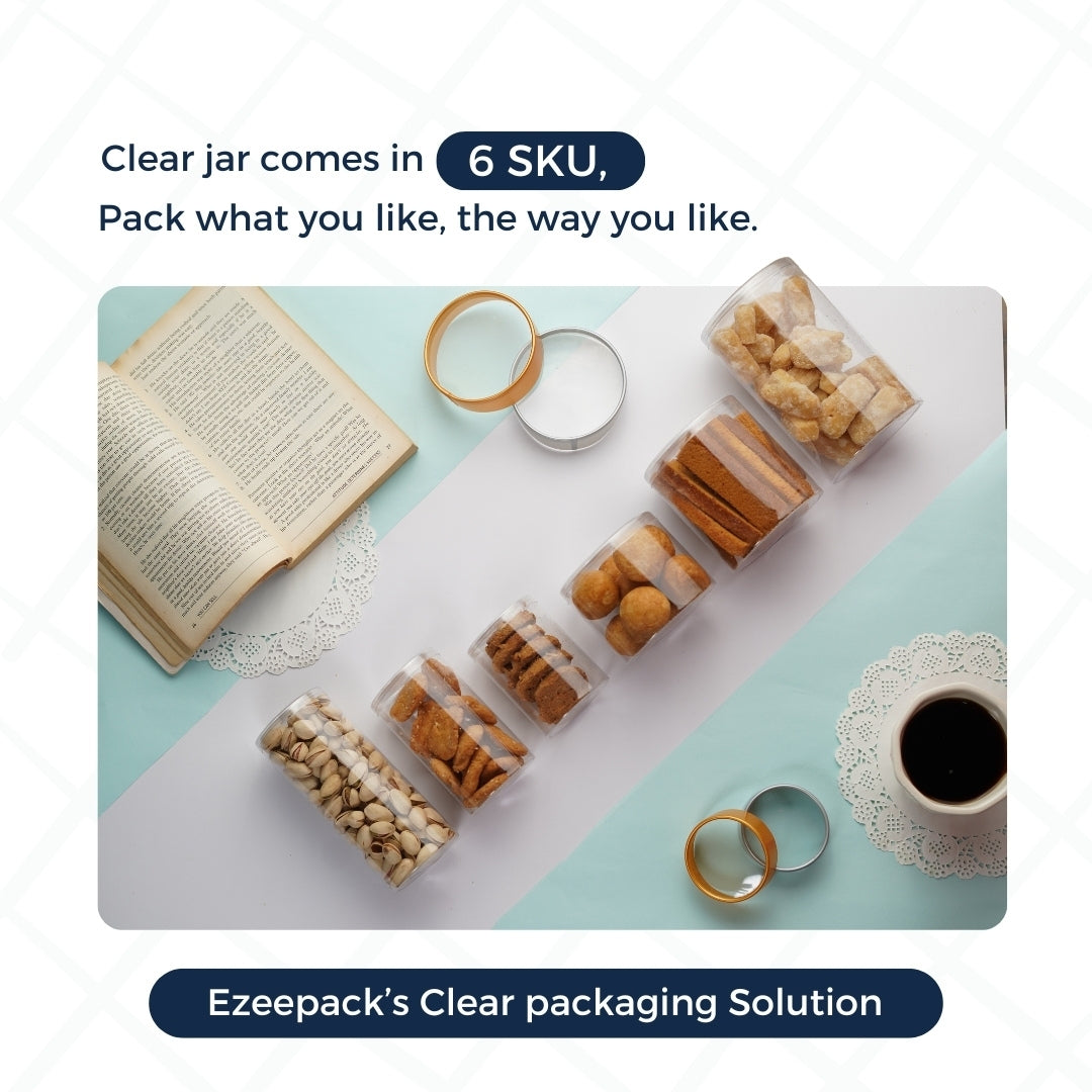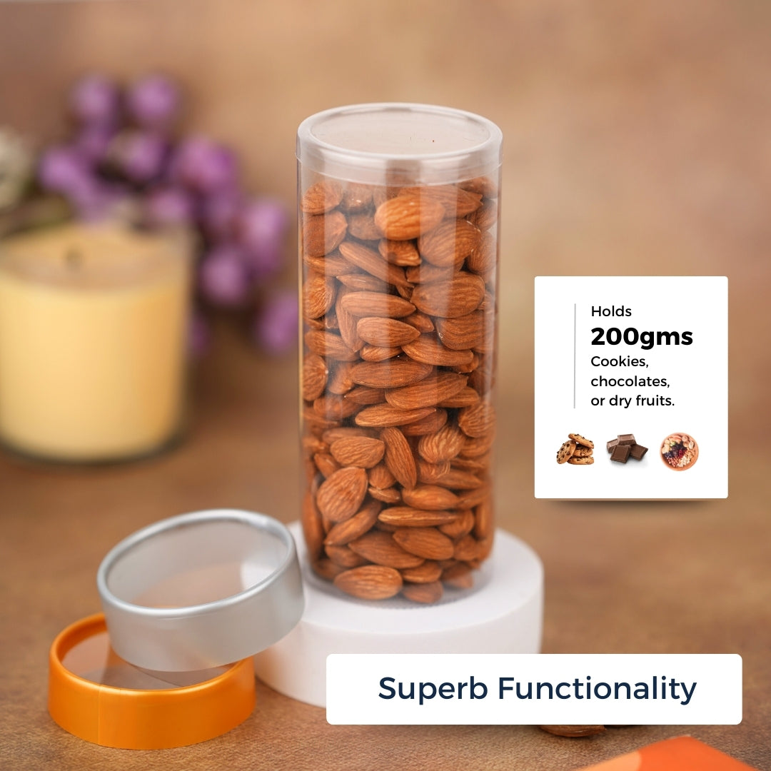 Maximize your storage with our 475ml Clear Jar, available with clear, gold, or silver lids. Made from high-quality food-grade 250 micron PVC, this jar offers durability and a sleek gloss shine. With dimensions of 2.5-inch diameter and 6-inch height, it can store up to 7-8 cookies, plenty of chocolates, or a large batch of dry fruits, making it perfect for larger storage needs. The high transparency and uniform wall thickness provide an attractive display, while the secure lid ensures freshness. Lightweight and easy to handle, it outperforms heavy glass jars and unreliable PET screw lids. The stylish design makes it a must-have for gifting professionals and general storage, adding a touch of elegance to any setting.