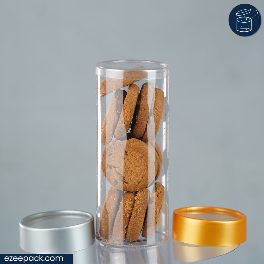 Maximize your storage with our 475ml Clear Jar, available with clear, gold, or silver lids. Made from high-quality food-grade 250 micron PVC, this jar offers durability and a sleek gloss shine. With dimensions of 2.5-inch diameter and 6-inch height, it can store up to 7-8 cookies, plenty of chocolates, or a large batch of dry fruits, making it perfect for larger storage needs. The high transparency and uniform wall thickness provide an attractive display, while the secure lid ensures freshness. Lightweight and easy to handle, it outperforms heavy glass jars and unreliable PET screw lids. The stylish design makes it a must-have for gifting professionals and general storage, adding a touch of elegance to any setting.