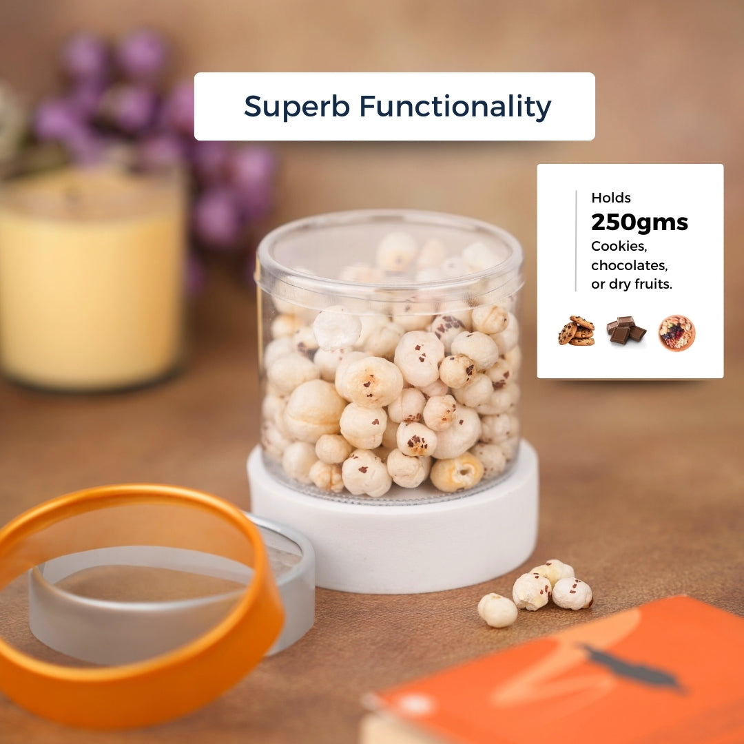 Our 525ml Clear Jar, available with clear, gold, or silver lids, is perfect for gifting and general storage. Made from high-quality food-grade 250 micron PVC, this jar features high transparency and a beautiful gloss shine. With dimensions of 3.5-inch diameter and 3-inch height, it holds 8-9 large cookies, a generous amount of chocolates, or a sizable serving of dry fruits. Lightweight yet durable, this jar offers a safe, airtight environment for your treats and goodies. The uniform wall thickness ensures sturdiness, while the crystal-clear material showcases the vibrant colors and textures of your contents. Ideal for both everyday use and special occasions, our 525ml Clear Jar combines style and functionality, making it a must-have for gifting professionals and anyone looking for elegant storage solutions.