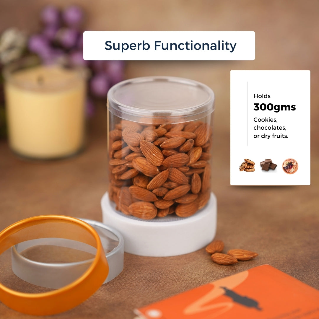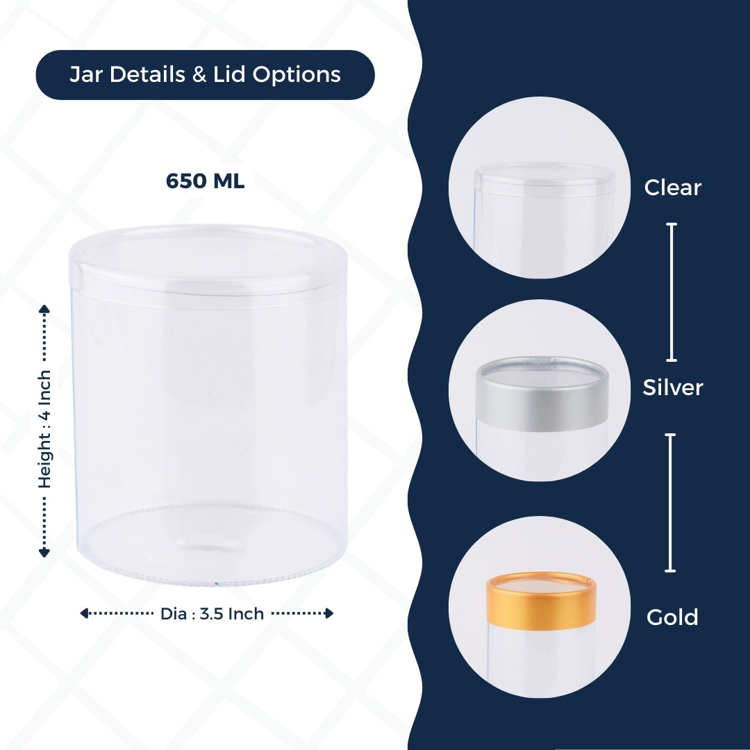 Our 650ml Clear Jar, available with clear, gold, or silver lids, provides extra storage with a stylish touch. Crafted from high-quality food-grade 250 micron PVC, it combines durability with an elegant gloss shine. With dimensions of 3.5-inch diameter and 4-inch height, this jar comfortably holds 10-11 large cookies, more chocolates, or extra dry fruits, making it ideal for larger storage needs. The high transparency and uniform wall thickness provide a sleek display, while the secure lid keeps your treats fresh. Lightweight and easy to handle, it’s a perfect alternative to heavy glass jars and unreliable PET screw lids. Ideal for gifting professionals and general storage, this jar adds a touch of elegance to any setting.