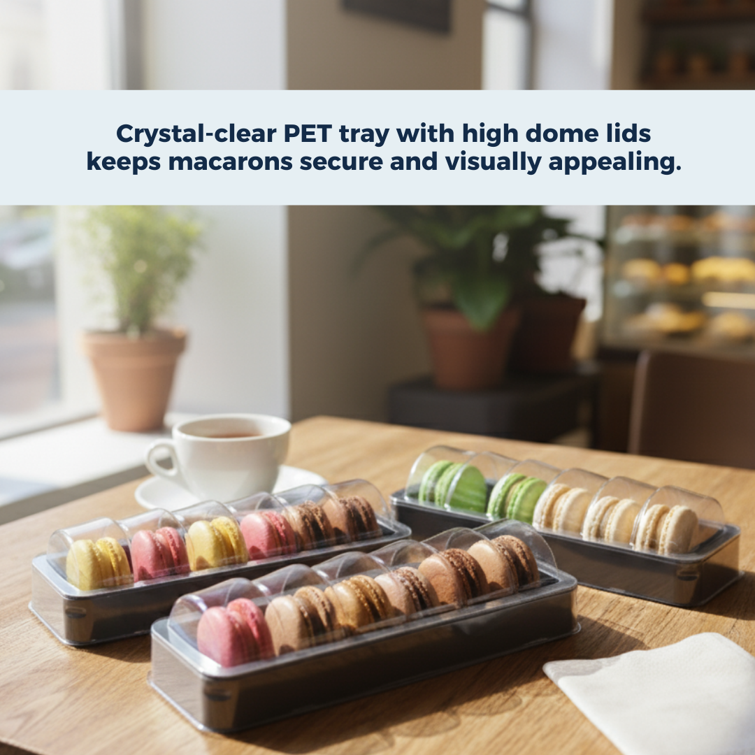 PET tray with high-dome lid keeps each macaron safe and beautifully displayed