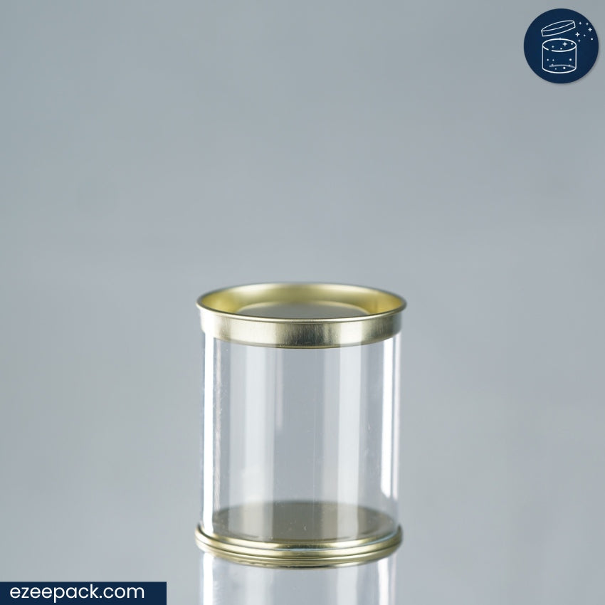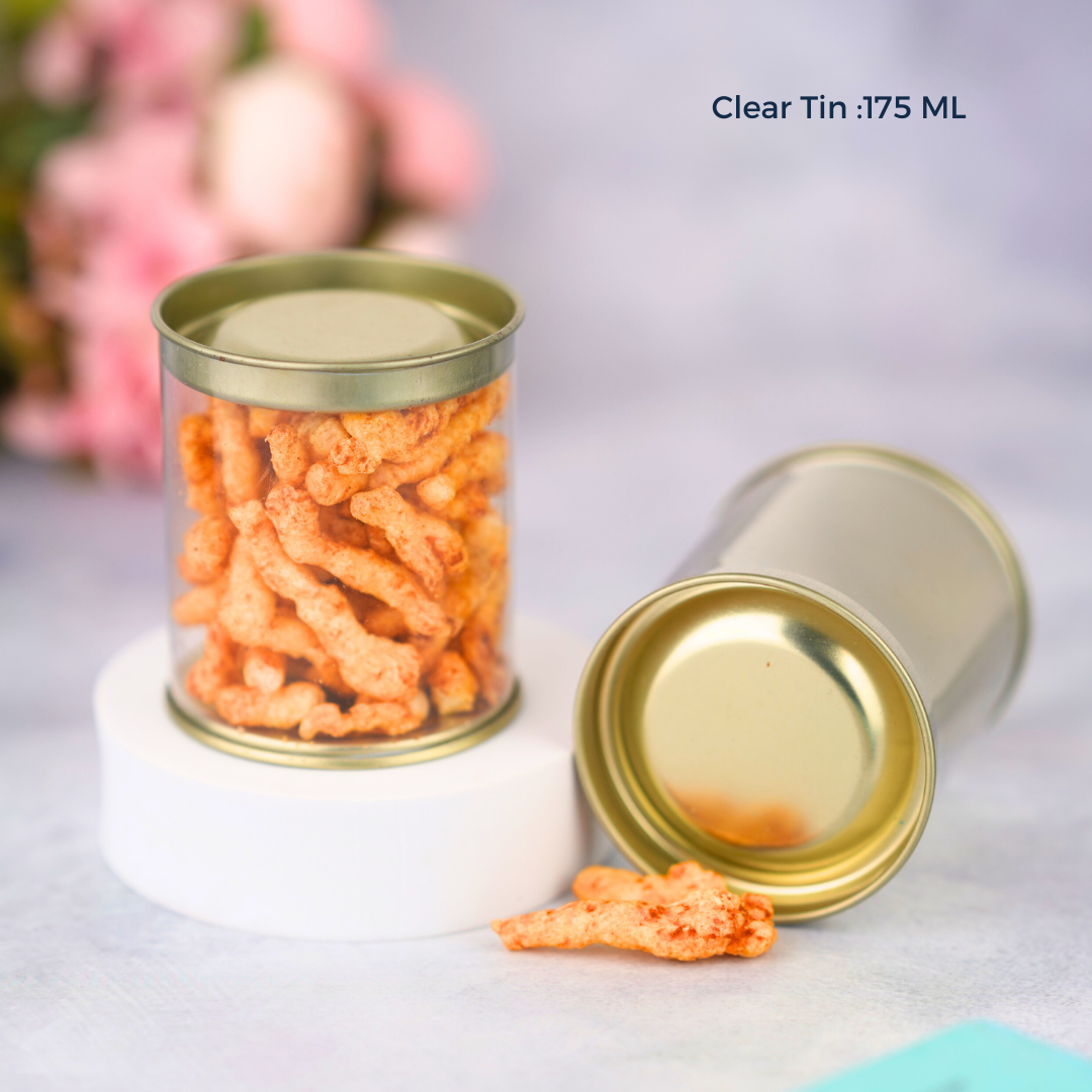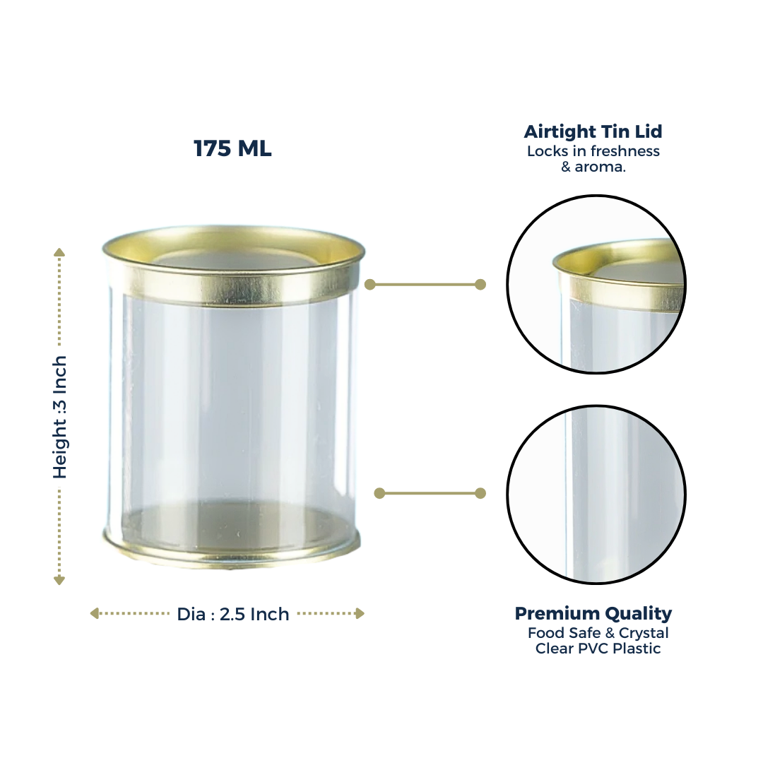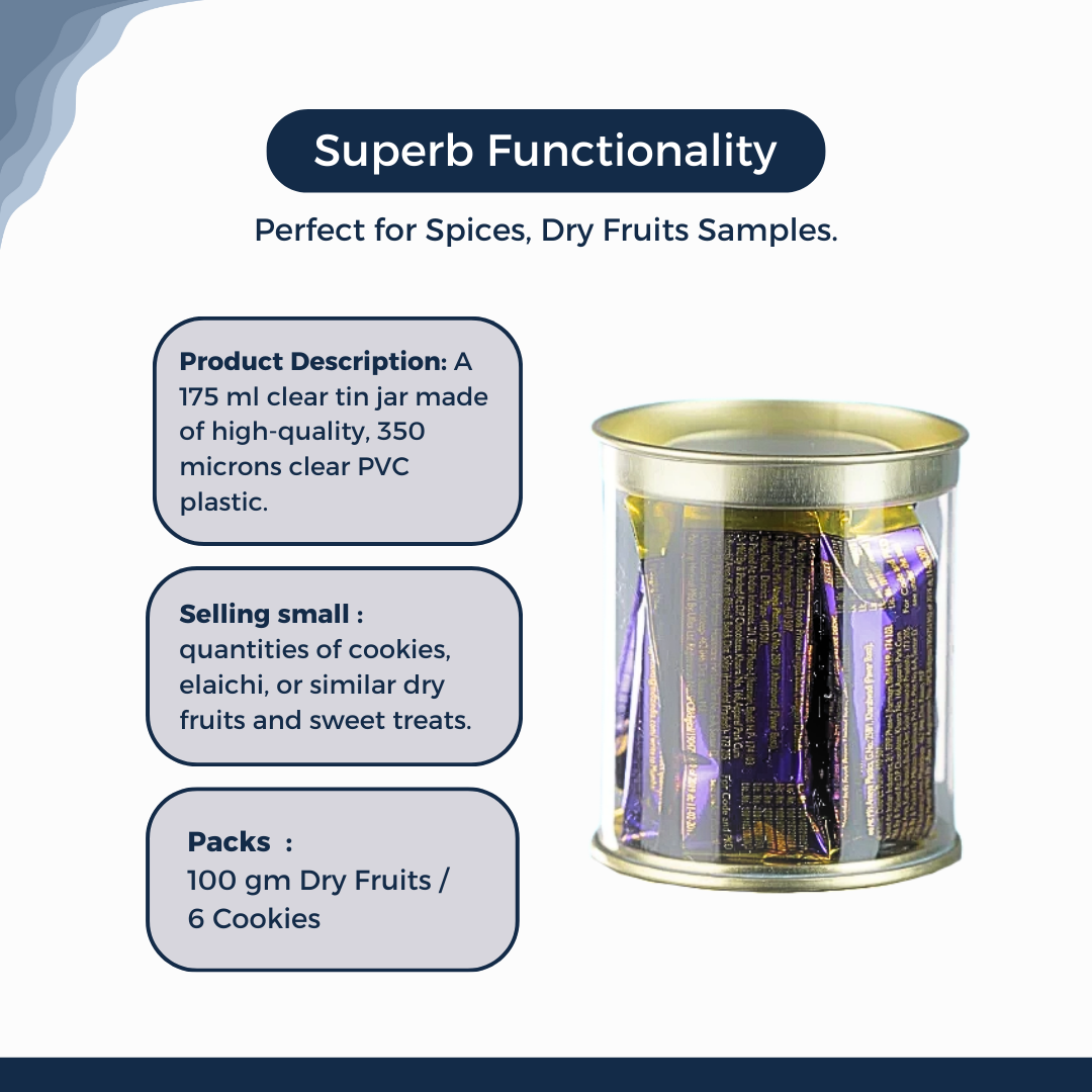 The 175 ml clear tin jar is designed to meet your versatile packaging needs with style. Measuring Diameter 2.5 inches, Height 3 inches, this jar is crafted from durable, 350 microns clear PVC plastic, providing an unobstructed view of its contents. It's perfect for selling small quantities of cookies, elaichi, or similar dry fruits and sweet treats. The food-grade material ensures safety, while the very high gloss finish enhances its aesthetic appeal, making it ideal for gifting or displaying on a shelf. The tin lid seals tightly to keep the contents fresh and secure. With its medium size, it strikes the right balance between capacity and portability, making it suitable for both commercial sales and elegant gifting. This jar is not only functional but also adds an elegant touch to any space it occupies.