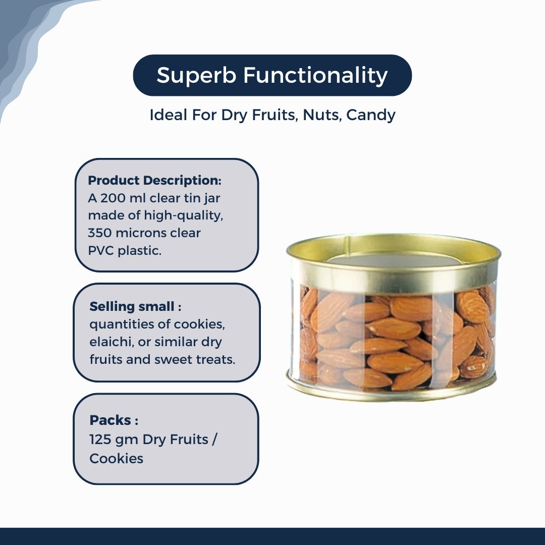 Our 200 ml clear tin jar is the epitome of practical elegance. Measuring Diameter 3.25 inches, Height 2 inches, it is constructed from high-quality, 350 microns clear PVC plastic, allowing for a full view of its contents. It's ideal for selling small quantities of cookies, elaichi, or similar dry fruits and sweet treats. The food-grade material ensures safety, and the very high gloss finish makes it perfect for gifting or displaying on a shelf. The tin lid ensures a tight seal, preserving the freshness and quality of the contents. Its generous size makes it perfect for larger quantities, while still being manageable for everyday use. This jar is a versatile addition to any setting, combining functionality with a sleek, modern look.
