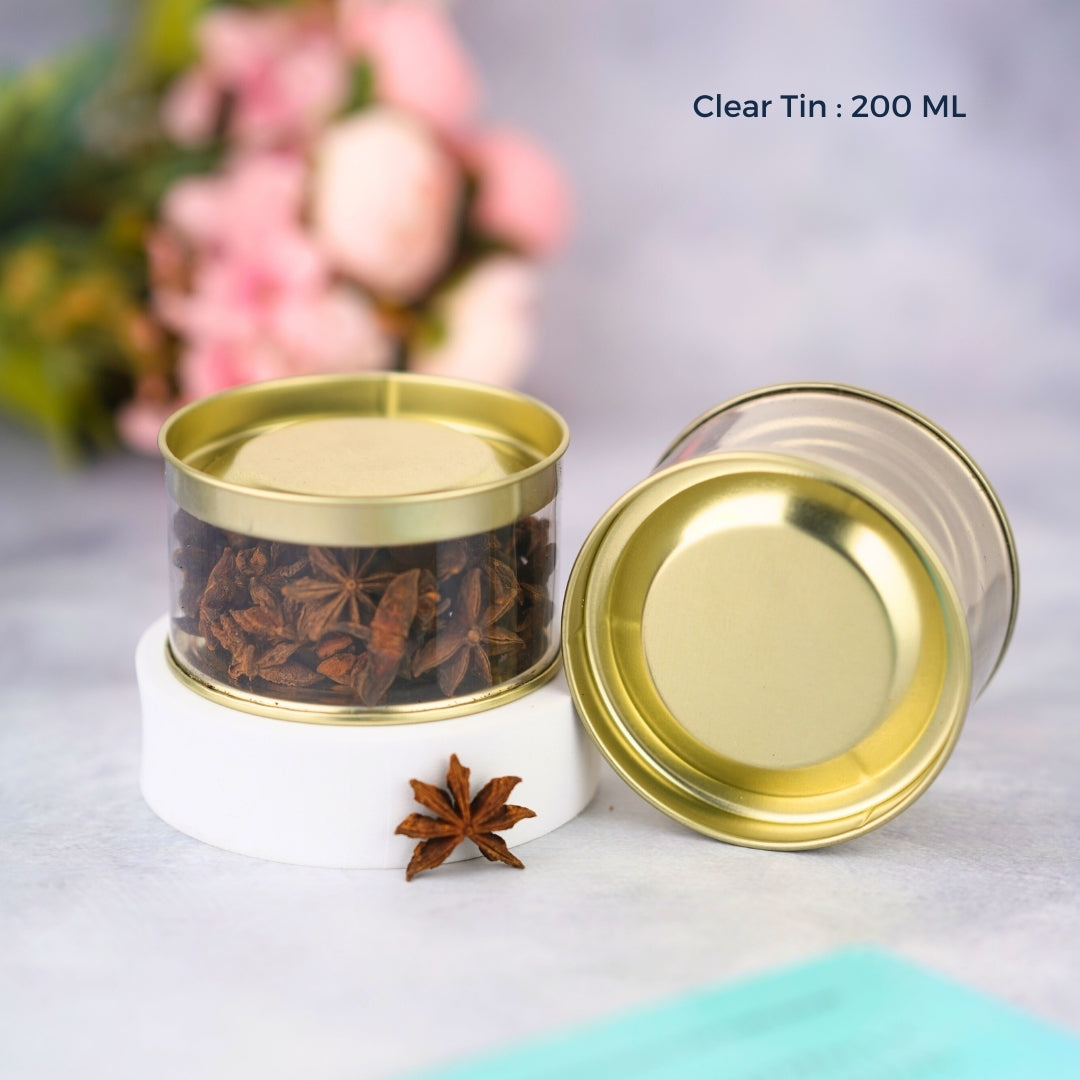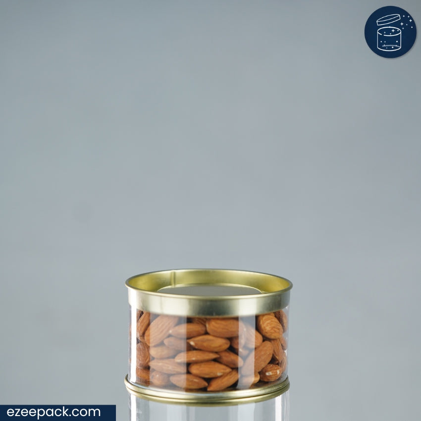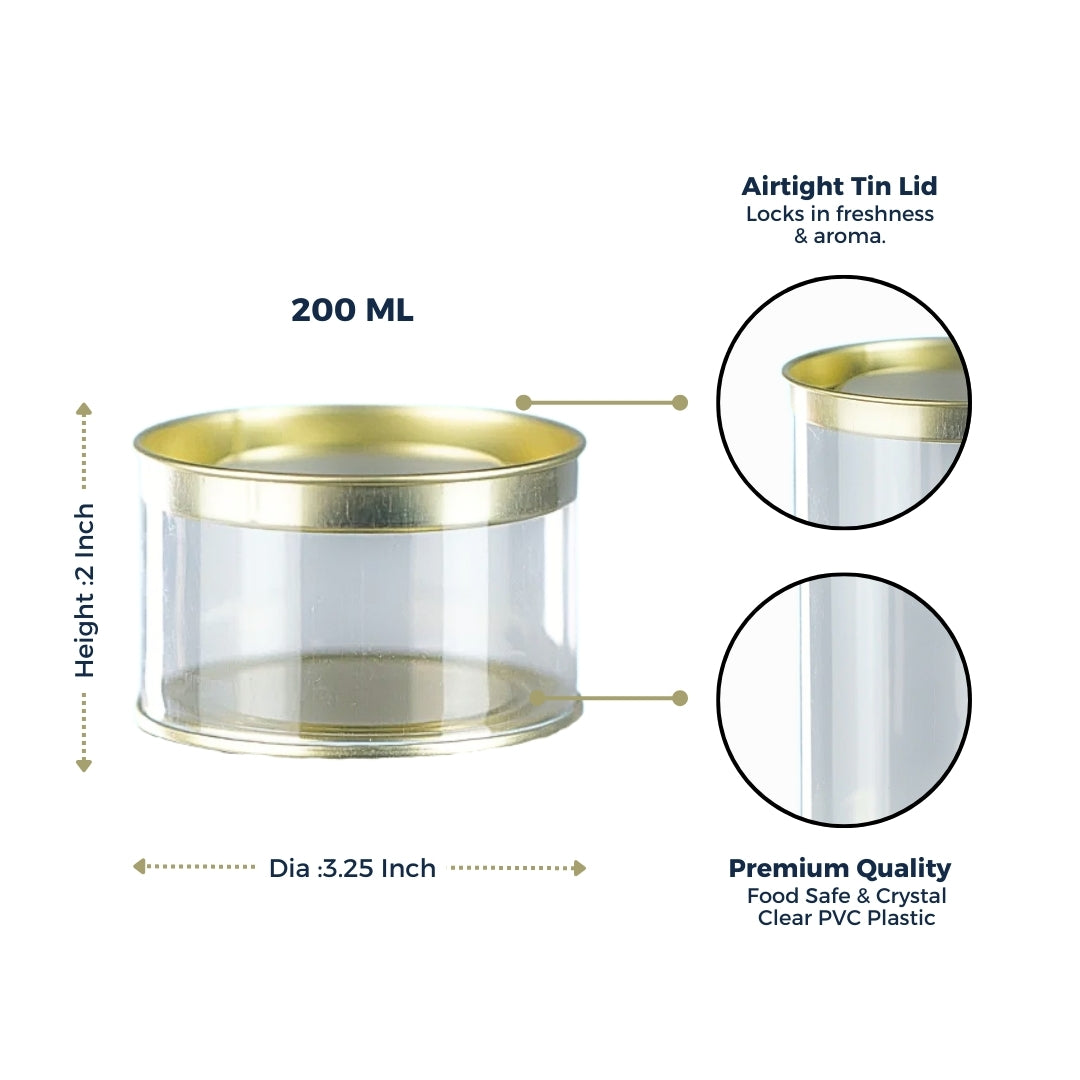 Our 200 ml clear tin jar is the epitome of practical elegance. Measuring Diameter 3.25 inches, Height 2 inches, it is constructed from high-quality, 350 microns clear PVC plastic, allowing for a full view of its contents. It's ideal for selling small quantities of cookies, elaichi, or similar dry fruits and sweet treats. The food-grade material ensures safety, and the very high gloss finish makes it perfect for gifting or displaying on a shelf. The tin lid ensures a tight seal, preserving the freshness and quality of the contents. Its generous size makes it perfect for larger quantities, while still being manageable for everyday use. This jar is a versatile addition to any setting, combining functionality with a sleek, modern look.