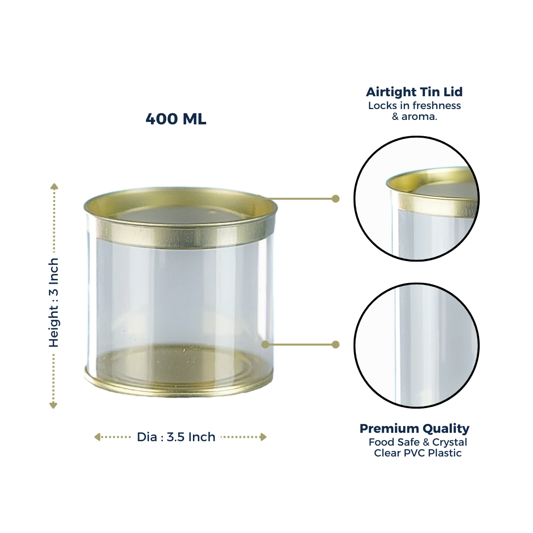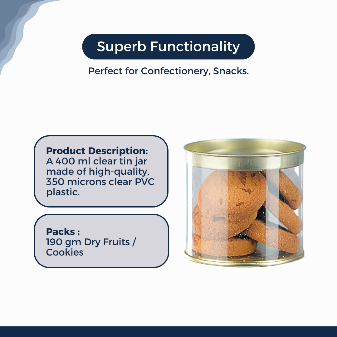 Transform your packaging game with Clear Tin, the innovative cylindrical jar that combines style and functionality. Available in sizes ranging from 250 ml to 1200 ml, these jars are crafted from transparent, non-toxic PVC material and feature sturdy metal tin ends. The bottom end is seamed and non-removable, ensuring durability, while the top lid can be easily removed and securely put back on.