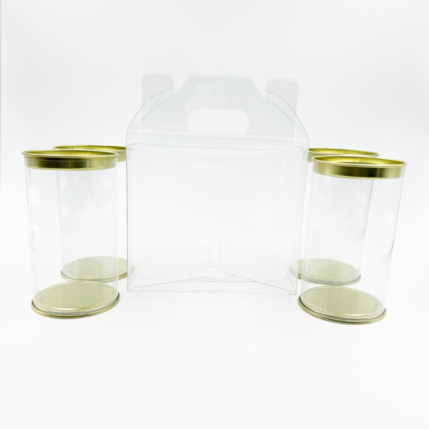 Our premium 4-piece clear tin jar hamper box offers a luxurious and versatile gifting solution. The set includes four transparent tin jars, each with a capacity of 350ml, and a matching clear hamper box.
