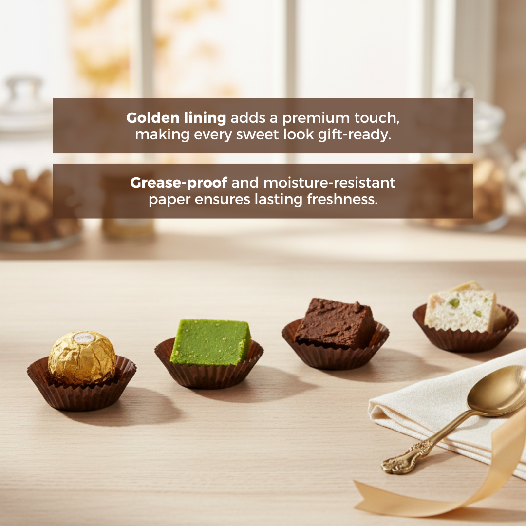 Perfect for Ferrero Rocher chocolates, mini desserts, or small Indian sweets, this Mini Chocolava Katori combines premium presentation with practical usability. Crafted from grease‑proof, moisture‑resistant, and recyclable paper with elegant golden linings, it adds a stylish touch to every sweet treat.